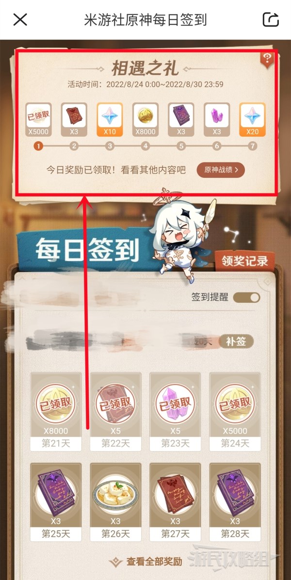 3.0版本相遇之礼累计签到活动已开启,活动时间为2022年8月24日0:00~2022年8月30日23:59。在米游社-签到福利完成每日签到,可额外获得对应累计签到天数的奖励。累计签到的额外奖励将直接发放至当前绑定角色的游戏内邮箱,邮件有效期为30天,记得及时领取。