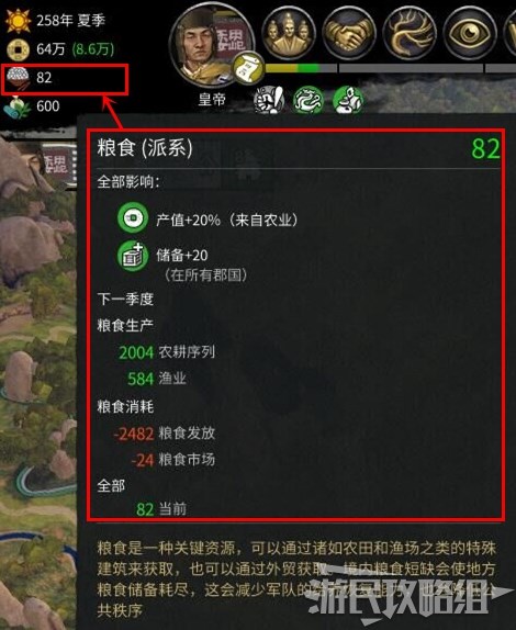 将鼠标悬停在战役地图左上角粮食图标可以查看当前派系内的粮食储备水平。