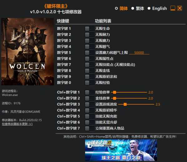 简体、繁体、English,可以切换语言 (切换语言后修改器将把该语言设置为默认语言)