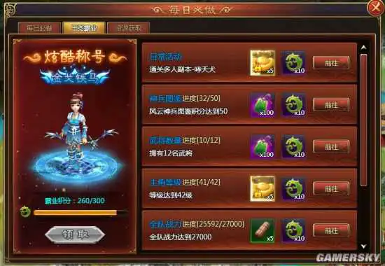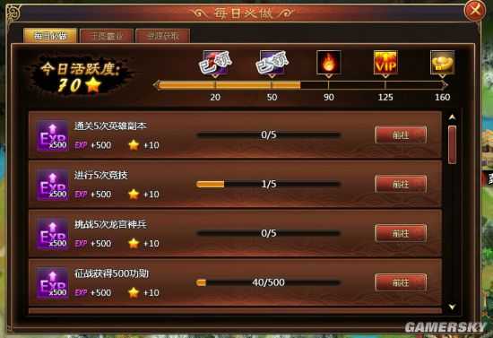 在“每日必做”中,每完成一个任务,可以获得活跃度积分,积分每达到一定值,均可领取一份活跃奖励,除了酒、银币、主角将魂这些资源道具外,还可获得VIP经验和系统元宝,通过努力也可以提升VIP等级,享受部分VIP特权!