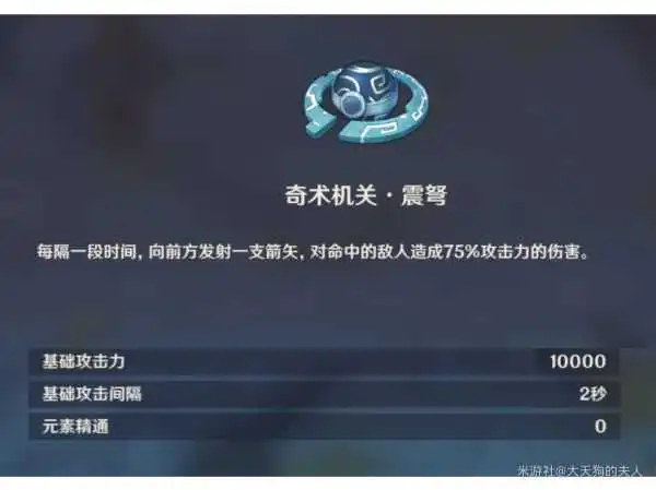 机关【震弩】攻击10 000 ,伤害倍率 75%,理论上造成伤害 10 000 x 75% = 7 500 ;