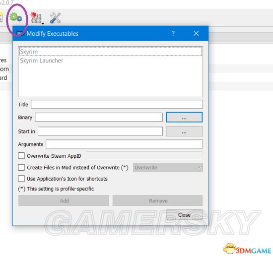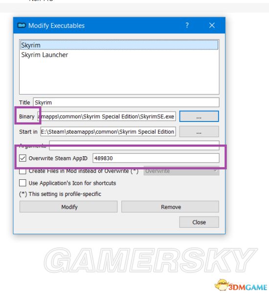5、在外部程序设定中,将skyrim的路径改为skyrimse.exe的路径,同样将skyrim launcher路径改为skyrimselauncher.exe的路径,并勾选“覆盖steam应用的id”,将二者的id改为;