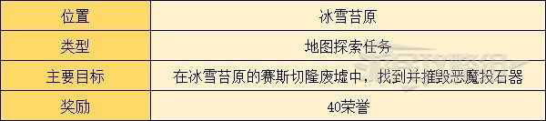 赛斯切隆废墟位于冰雪苔原的东北方,找到并摧毁这里的30台恶魔投石器即可完成任务目标。与投石器互动后需要读条几秒才能将其摧毁,因此为了避免被敌人打断,最好还是先清理掉附近的怪物。