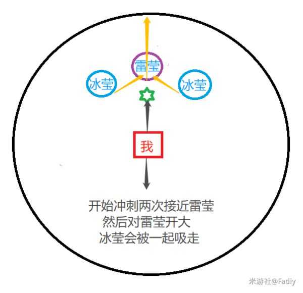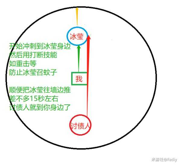 讨债人和冰莹离得非常远。那么开始的时候可以用重击、技能等不停打断冰莹,同时将冰莹往墙边推,讨债人过15秒左右就会来到角色身边,此时风主对着雷莹和墙开大。将两个怪聚在一起,防止讨债人冲过头。