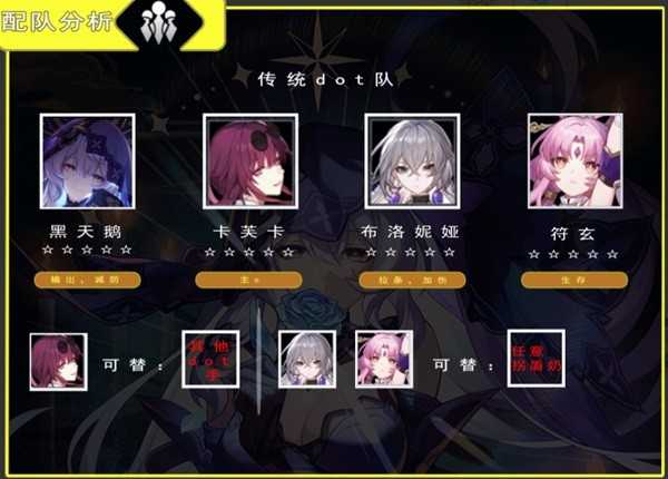 分析:传统的dot队,如果对队伍生存有信心可以将一个生存位换成dot手,手法在上文黑天鹅和卡芙卡的适配性板块有讲