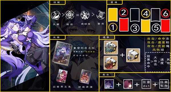 分析:降低效果抵抗的词条说没用它确实可以让奥迹挂的记录更大,说有用为什么不能设计成直接加效果命中呢?降低效果抵抗反而无法吃到第三行迹的伤害加成。回能可以加快轮转,在对单时有些乏力。