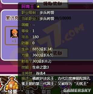 在村长征战团网页游戏里,武将阿育王获得的初始值为紫品1级武将,游戏中阿育王并不是常驻武将,目前只能通过活动获得。同时暂未加入武将卡牌收集,不过村长征战团武将阿育王的属性是目前游戏中步兵武将中属性较为出众的,因此在近日的活动中建议收集该武将。