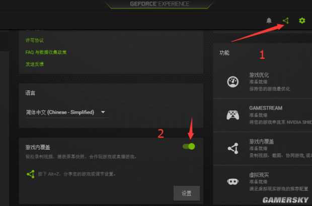 然后,我们设置,用户名边上的齿轮,1启动游戏内覆盖,2变成绿色了,表示已经启动了,这个时候你按ALT+Z就可以开启录制菜单。