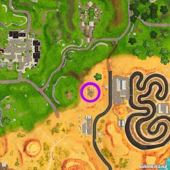 在零售商场右侧,沙漠跑道的左侧,沙漠和绿洲的交接地带。如紫圈所示。