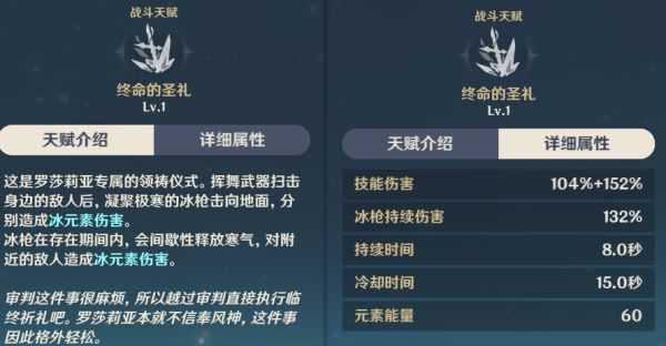 【终命的圣礼】使用时分为俩段伤害,背后攻击+冰枪撞击。再使用后冰枪会间歇性的向周围发动冰属性寒气攻击。只有再释放完【终命的圣礼】换人才能触发罗莎莉亚的第二被动暴击拐。