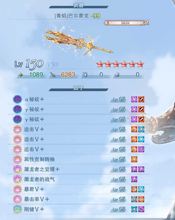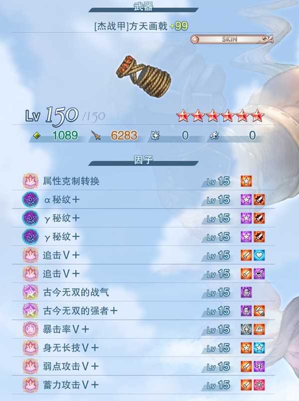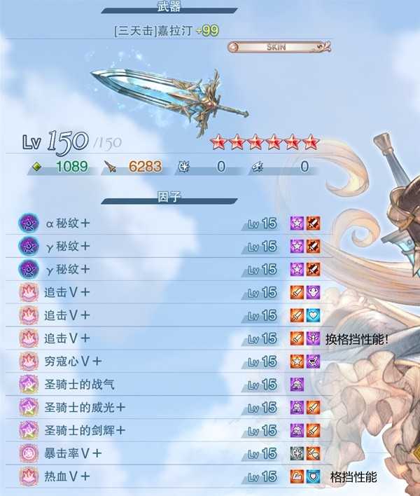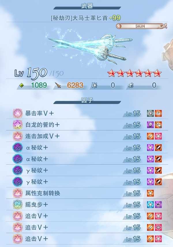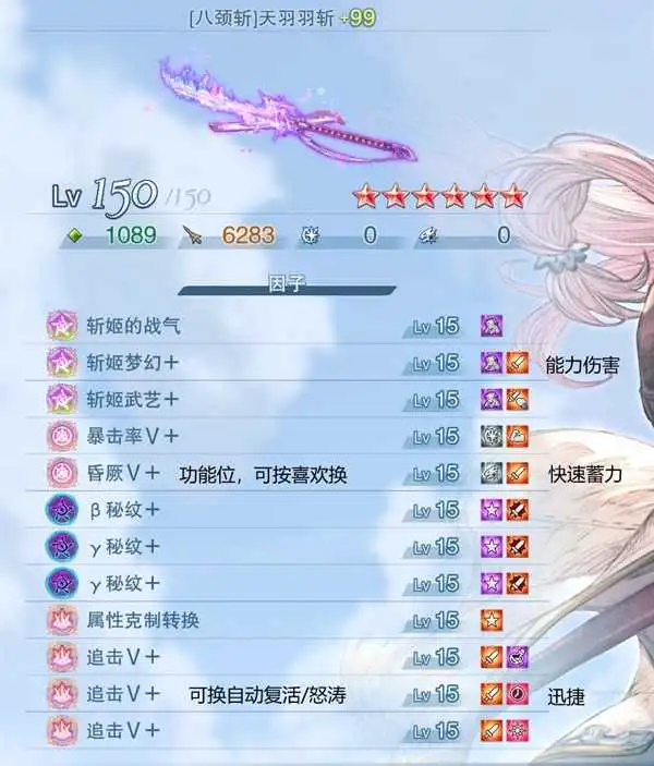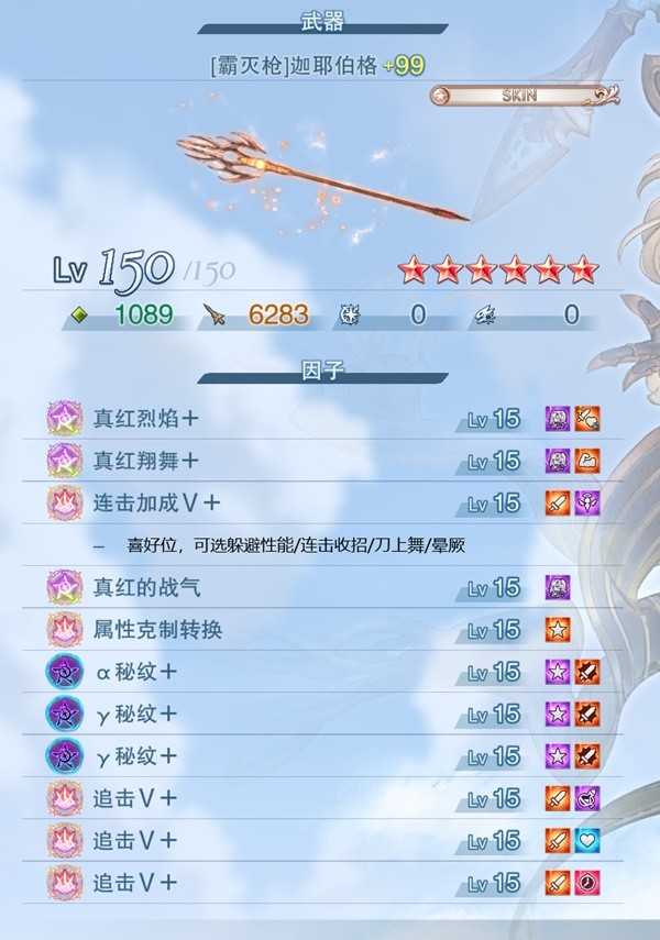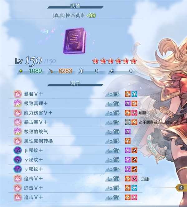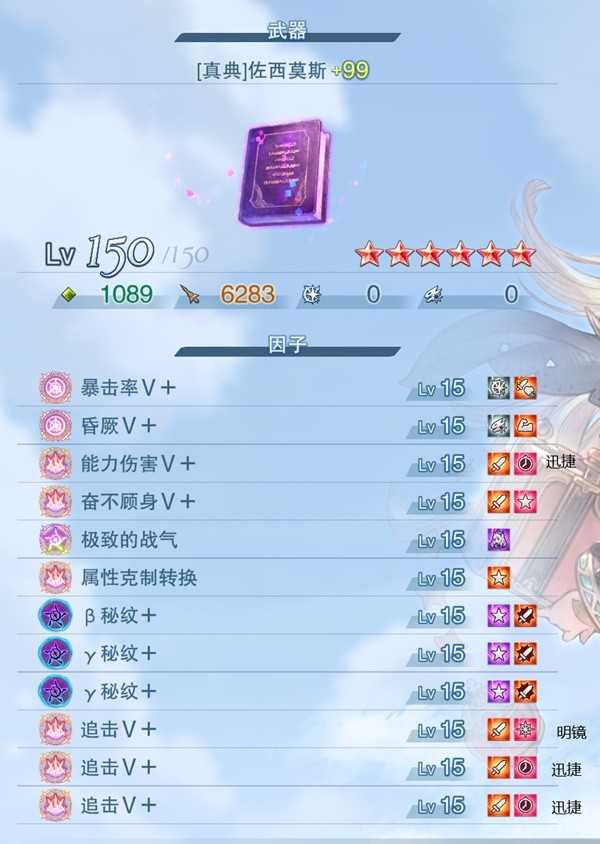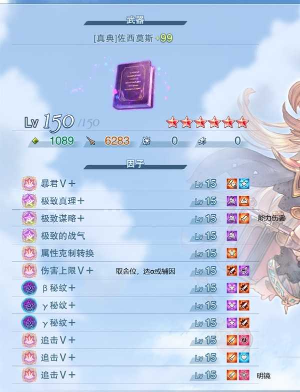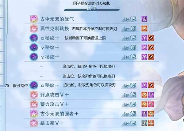 是因子搭配最多变的一个角色,这套属于带战气偏团队输出型,因为战气原因必须带明镜补奥义缺口,现在带战气奶刀都要当刀上舞来玩