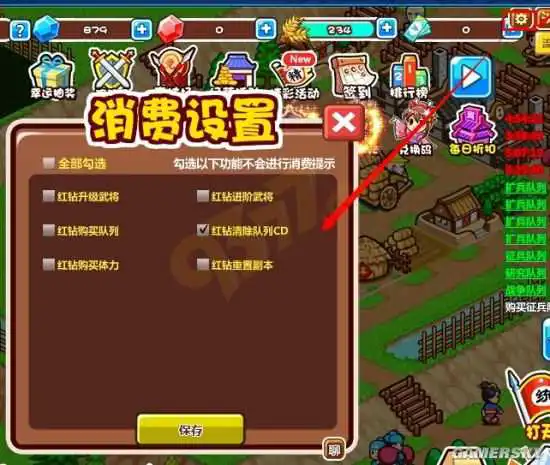 玩家要使用消费提示设置功能,直接在游戏界面右上角出,找到一个齿轮状的小图标,该小图标进入到消费设置界面,只要勾选相应的选项的,就不会再接收到相应的消费提示啦。目前,村长打天下的消费提示设置选项主要有6项,分别是红钻升级武将、红钻进阶武将、红钻购买队列、红钻清除队列CD、红钻购买体力、红钻重置副本。