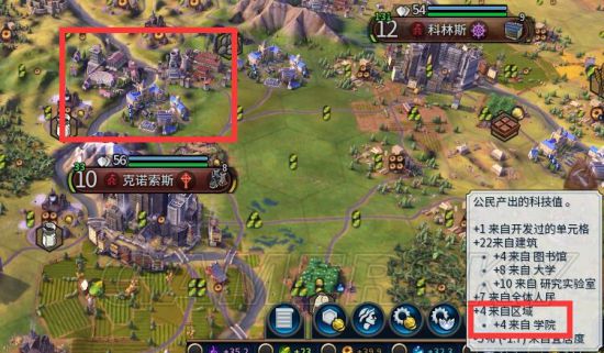 克诺索斯的学院贴靠近了另外两个城区-一个是工业,一个是文化所以多+1科研,而且有了这个正常