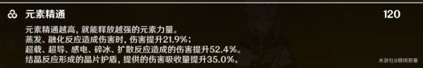 阿贝多天赋加125点精通,这里选120点做例子,可以看到融化加21.9%,扩散可以加52.4%