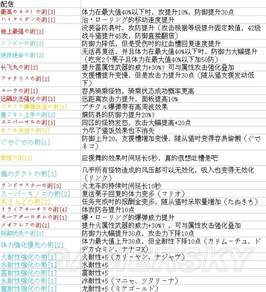 汉化版出了之后,一直在用猫猎solo,顺便体验剧情,虽然日文也一样玩,但还是中文舒服,怪猎是个好游戏,值得慢慢体会。为此我特意去找了猫猫全技能的资料,想全面了解一下猫猫的玩法。猫猫有些被动技能是配信专有的,正常游戏中是招不到带有那些技能的猫的。