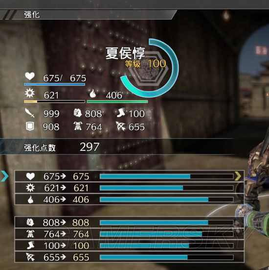 图1为黄武器+0加点, 100级的裸属性,可以看到攻击为999,我们现在去砍虎牢张辽,这里可以看到 无双打空张辽血为这样。