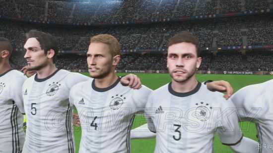虽然说了那么多,但是还是要吐槽一下这个人物模型和画面。由于是试玩版所以只有在选择法国队和德国队的时候,赛前会有人物的特写镜头(唱国歌时)。但是这个画面对于我而言只能说是过于渗人了,特别是球员的眼球看起来实在是太可怕了,那些现实中大眼睛的球员你在游戏中看到的却是双目圆睁,戾气十足的样子。黑人球员更是没有人权,一个个看起来都像是没有睡醒被人强行拉过来比赛一样,一脸的倦意。那些眼球颜色浅的球员看起来就像是失明的人一样,这眼球颜色是在是太浅了都没有眼珠了。最可怕的一点是有些球员的眼球会不时左右移动,但是这场景绝对不是你所想象的那样,他的眼珠会从眼眶的一边移动到另外一边,然后再移动回去,虽然知道这个画面是要表示球员的紧张状态,但是实际上看起来是在是过于惊悚了一点。不过在球员的面部表情上面,实况2017做的还算是不错的,即使同FIFA进行比较的话。球员在各种状态下面的表情动作,刻画的都是相当不错。球员的红牌之后的“围攻裁判”,与进球失之交臂之后的捶地泄愤,在本方球员吃到黄牌或者被吹罚任意球是对裁判的施压等等画面看起来都比较自然真实和流畅,即使放在FIFA系列的游戏中这样的画面表现力也是无可指责。