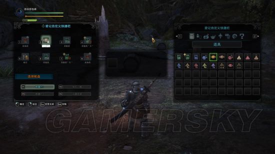 类型改完之后,你就会发现你的F1F2F3F4有反应了,按完之后会出现大家喜欢的,但是在说设置之前说下这几个键位,不是常驻在屏幕上的,我也不知道为啥不能常驻,反正狩猎的时候1234又没用,这样增加了操作步骤,每个东西需要用的时候,必须先按下F1F2。。着实有点脱裤子放屁了。不过也是有好处的,那就是这所有的4X8=32个键位,全都是快捷键位,什么是快捷键位呢?你用快捷键位的砥石,磨刀是不需要收刀的,用快捷键位的调和,不需要打开列表咔咔咔就调和了,比如扩散神教的,把调和扩散弹放到F1的5上,按一下F1,然后疯狂5就可以了