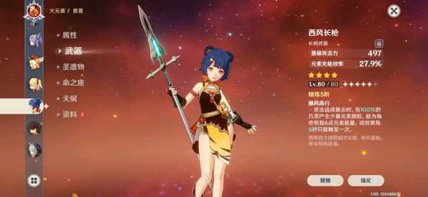 这把强枪是目前最好的枪,但是舒适度对于香菱还是比较差,圣遗物磁条可没那么好刷,用这个就真得搞180充能以上才舒服。不然也就爆发一下,你怪打完了才充能好。满级暴击率22.1。满精提升42攻击力24伤害,这样收益就很高,但是这玩意5精真得有钱才行所以,推荐程度不高
