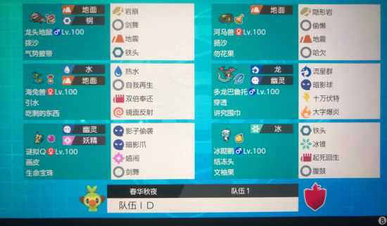 全队基本没有微调的努力值(都是252+252+4),其中沙河马和海兔为hb,多龙为cs,地鼠谜拟Q冰企鹅为as。