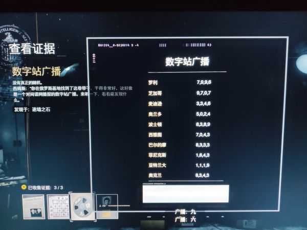 游戏里解密的第一行输入数字密码,第二行输入城市密码,在游戏流程有三张证据提供。