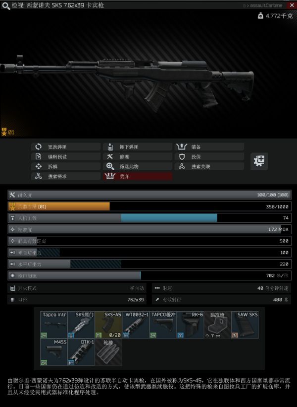 SKS也推荐萌新使用,便宜1W4卢布就可以购买,子弹用BP好点(略贵能接受),改枪只需要弄成20发弹夹就好,有需要可以加镜子,我不太习惯SKS加镜子。不用按图片改,这是我捡的,我一般随缘用枪,子弹好就行。