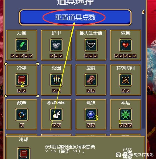 道具的升级顺序建议:幸运>冷却≈磁铁。每次打完都建议重置一下看看能不能解锁“数量”,个人感觉数量非常的关键。