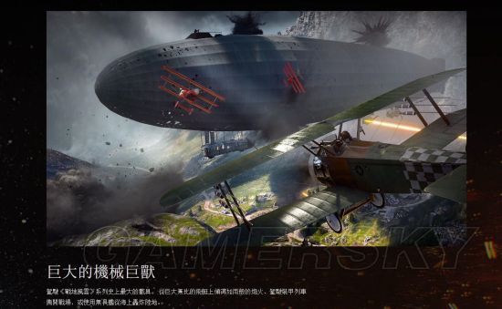 巨大的机械巨兽:驾驶《战地》系列史上最大的载具。从巨大无比的飞艇上倾泻如雨般的炮火、驾驶装甲列车撕开战场,或使用无畏舰从海上轰炸陆地。
