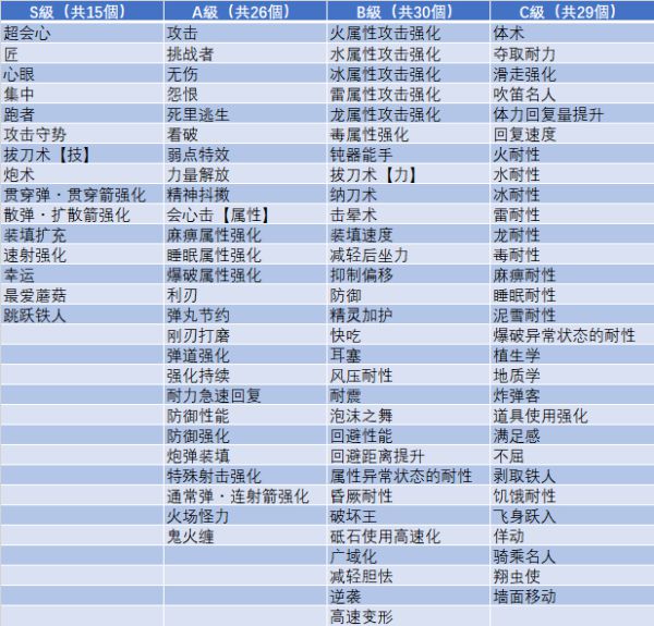 首先,在mhr v1.1.1版本里面。技能被分为四个档次,分别是SABC这几档。