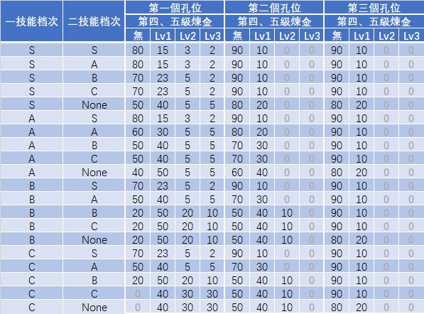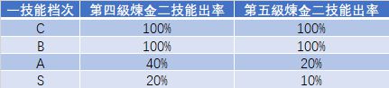 然后,不同档次的一技能能够抽选出二技能的概率,可以看到五级炼金出二技能的概率居然比四级炼金低。不过看看上面就知道,5级炼金有些废技能是不会出的,以及S级跟A级技能的出率都比四级炼金高一点。