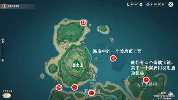 ②:知比山附件有9只奇馈宝箱,其中四号位点在海底一处屋顶上,23号需要羽毛。