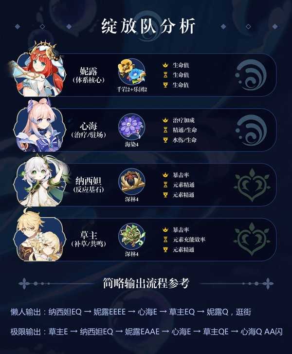 众所周知强度高的队伍都是互相成就的,每个角色都会在功能性或者输出方面发挥不可或缺的作用。因此对于「妮露」来说「草主」是必然要首先替换的,目前ta的作用只是凑双草和补附着。为了保证循环需要堆大量充能,本来就亏输出属性,「妮露」队没有激化的情况下并不能提供多少伤害。