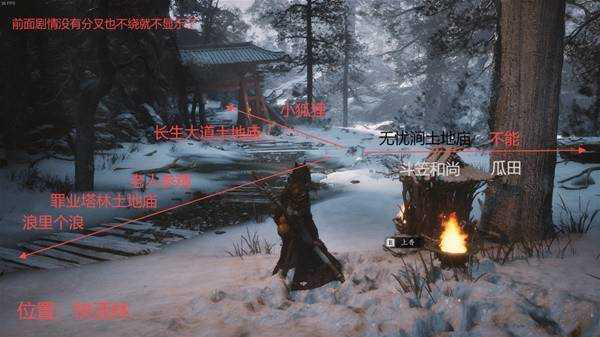 ⑦ 【戒语廊土地庙】→【打坐蒲团】→ ⑧ 亭子里遇到小和尚→ ⑨ 拜四个佛→和小和尚对话找上山的路→ ⑩ 【一念壁土地庙】→ ⑪ 第一次打不白→打不白的地方悬崖找地方跳下去,佛头上拿到【想蕴】→【打坐蒲团】处再次打不白