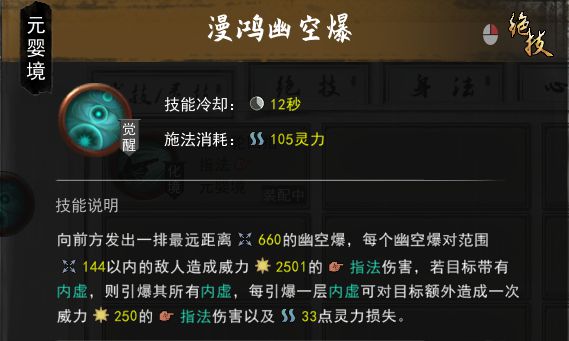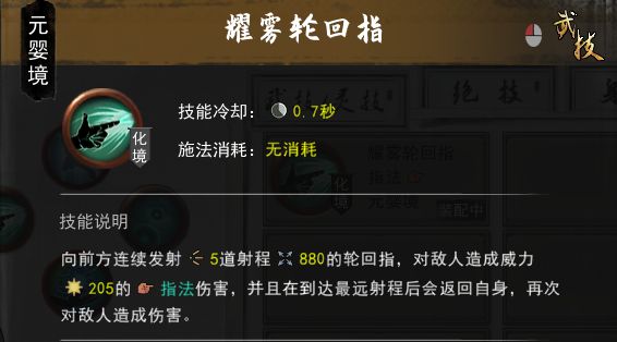 于是通过引爆目标身上的“内虚”就可以使目标损失灵力,并使自己获得“灵虚”层数。这里就引出了我选择武技轮回指的一个原因:因为轮回指是向鼠标所在位置依次打出x(与技能描述和熟练度附加词条有关)道轮回指,然后再返回,这样一次鼠标就能在理想状态下完成2x次打击,相较于另外两个指法武技两仪指和无相指能够快速叠加“内虚”效果。