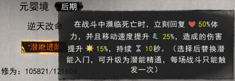 之后还需要一些防御性的逆天改命来保证自己能坚持到释放冲虚指,我自己选的是潜能入门再潜能进阶。这样我自己到元婴的5个逆天改命就完成了,实际是两个我认为比较契合套路的逆天改命。当然也可以选择红尘剑匣,因为后期轮回指单次攻击就可以叠十几层红尘剑匣,全看个人刷出来的逆天改命。