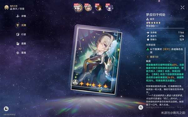 事实证明流萤需要堆的确实是击破特攻,速度以及攻击力,这里但是官方给的试用流萤,击破特攻都是264,也就是说在玩家手里可以更高,而且像阮·梅,同谐主这种队友还能提升提升击破特攻,因此最终属性还会更高。(而且这里流萤的攻击力也不是很高,因此还有极大的提升空间)