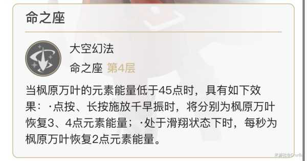四命:中规中矩的命座,其实一命的双e充能已经可以满足万叶的需求,大地图也只能算是偶尔能用到,属于比较一般的命座。