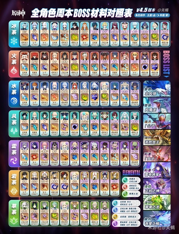 角色头像背景的颜色代表对应的元素颜色,头像外框的颜色代表星级,每行的角色出场顺序:优先5星角色(金色框)其次4星角色(紫色框),图表右侧是全周本名单以及各元素宝石掉落对应BOSS参照表