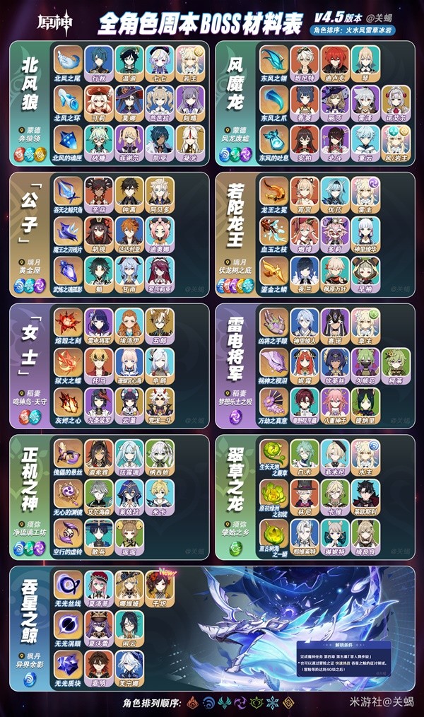 你知道《原神》角色升级突破所需要的素材都是哪些吗?不知道的话不如来看看由“关蝎”为大家带来的《原神》4.5版全角色需求材料BOSS对应表吧,希望可以帮助到大家。