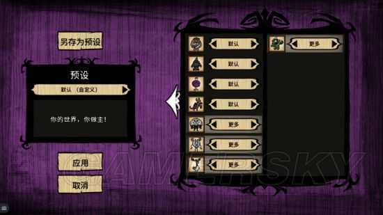 1.首先是地图,我们使用威尔逊这个游戏初始角色,为了能够看到冬季boss的打法,我们将各种boss调成更多~同样的,我们这里设置秋季开局,也是为了更好地攻略
