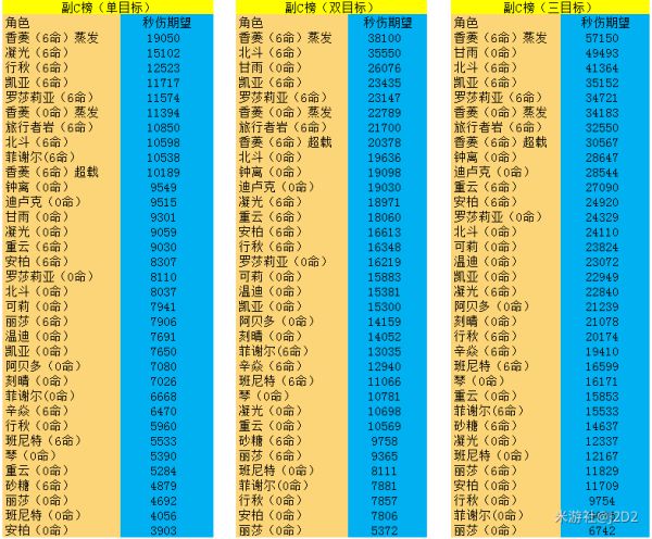 本榜单根据合理配装副C角色的伤害能力进行排名。根据敌人数量,榜单细分为单目标、双目标、三目标分榜。蓝色列数值为该角色卡CD释放元素战技和元素爆发的实际秒伤(基于技能CD计算)。每个角色都按照能使其伤害最大化的方式进行配队,比如罗莎莉亚穿冰套打冰冻队,而非穿冰+宗作为其他角色的挂冰工具人。所有角色都已将元素反应纳入计算。计算时不包含队友buff,只将自身buff以及元素共鸣效果纳入计算。