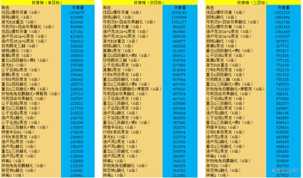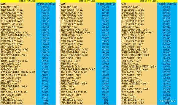 核弹榜较特殊,分为两类,第一类按照总伤害量排名,蓝色列数值为该技能吃满各种伤害加成后的实际伤害。第二类按照总伤害量/动作时间排名,蓝色列数值为该技能吃满各种加成后的实际伤害/动作时间。计算时,已将队友提供的BUFF纳入其中,暴击率爆伤配比为1:2,所以不是极限伤害(胡桃较特殊,为了体现其6命价值,减少了其暴击率并分配了更多的爆伤)。已将元素反应纳入计算。