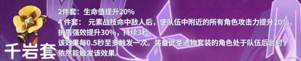 千岩套:二件套的效果提升了久岐忍的血量,四件套后台为队友辅助,增加攻击力20%,护盾强效30%,既能增伤又能增加奶量,满分十分的话我能给八点八分(狗头)
