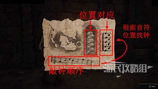 卷轴上的钟图案和右侧音符的位置是一一对应的,下边乐谱上的音符就是敲钟顺序。以下边乐谱上第一个音符为例,这个音符在第4根线和第5根线之间,对应到右侧音符就是右边一列从上往下数第4个,所以第一下需要敲这个钟。以此类推就能知道所有需要敲的钟和顺序,下边直接放答案↓↓↓