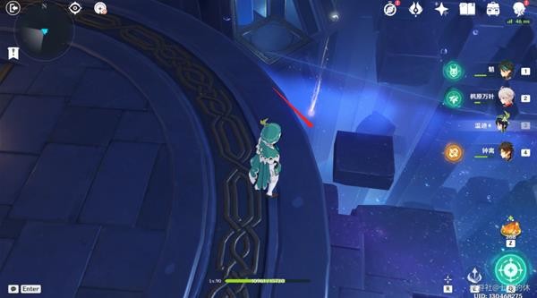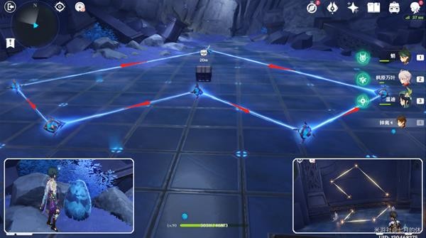 地上有连线图案,需要踩这4个压力板,改变星星的位置,使得天上的星像图和地上一样。(注意:每次进游或秘境,踩压力板移动星星的轨迹是不一样的,所以这里没有固定答案!)