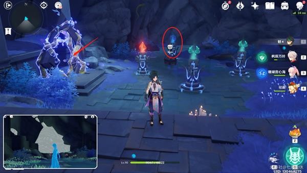 上图拿完宝箱,开启元素视野,依然看到白色山体,靠近消失,往里走,看见4个水元素方碑,复苏之门可以进行队伍配置,换火、水、风元素角色,用水元素角色攻击红圈标记的水元素方碑,出现水,水中倒影才是其它3个水元素方碑的实际元素,用对应元素攻击即可出现宝箱。