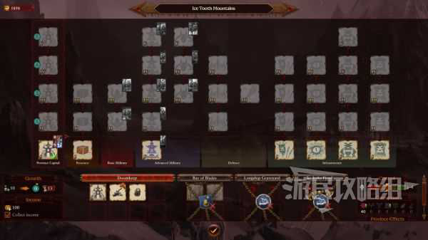 - 基础建筑:一共四条建筑链。①提供发展并降低招募成本;②增加收入;③增加补员速率、神耀产量和腐蚀(后两者取决于神),掌控力足够高时还能增加收入;④提升掌控力并增加可驻军单位。