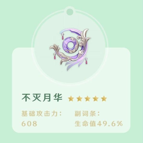 提升装备者的生命值与治疗加成。但该武器必须要在开启元素爆发后站场普通攻击才能为自身恢复元素能量,与白术的机制格格不入,但也是白术的推荐武器之一,在有条件为白术提供更好武器时,没必要为了白术下月华的武器池,更推荐白术携带专武或金箔。