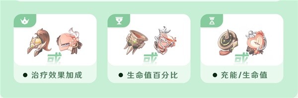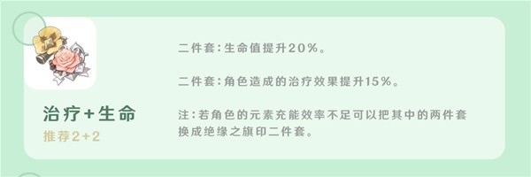 由于白术目前没有合适的四件套圣遗物,故白术的圣遗物大致都围绕着生命值、充能和治疗进行搭配。