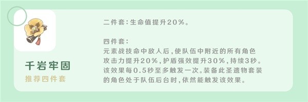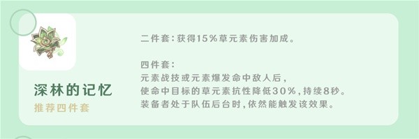 白术进绽放队或辅助草元素主C时可以选取的圣遗物。但由于白术元素爆发的灵气脉为单体攻击,故草4的覆盖率不会很高,建议白术2命时携带。